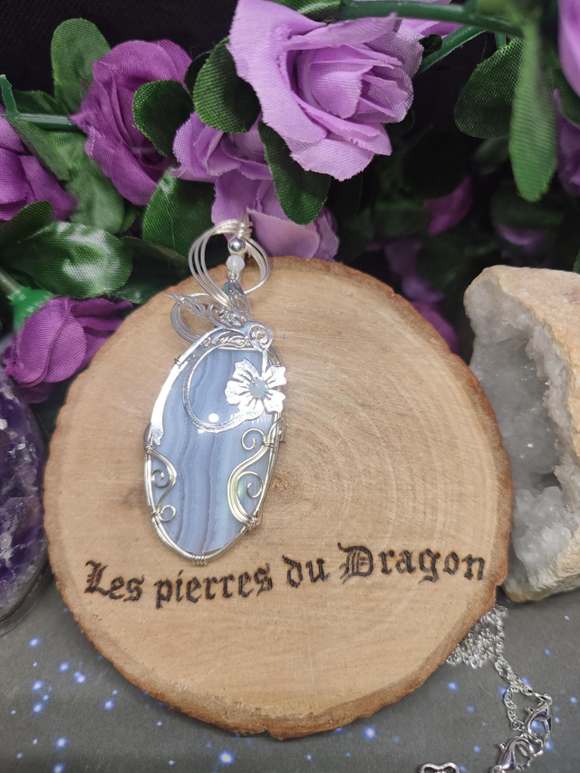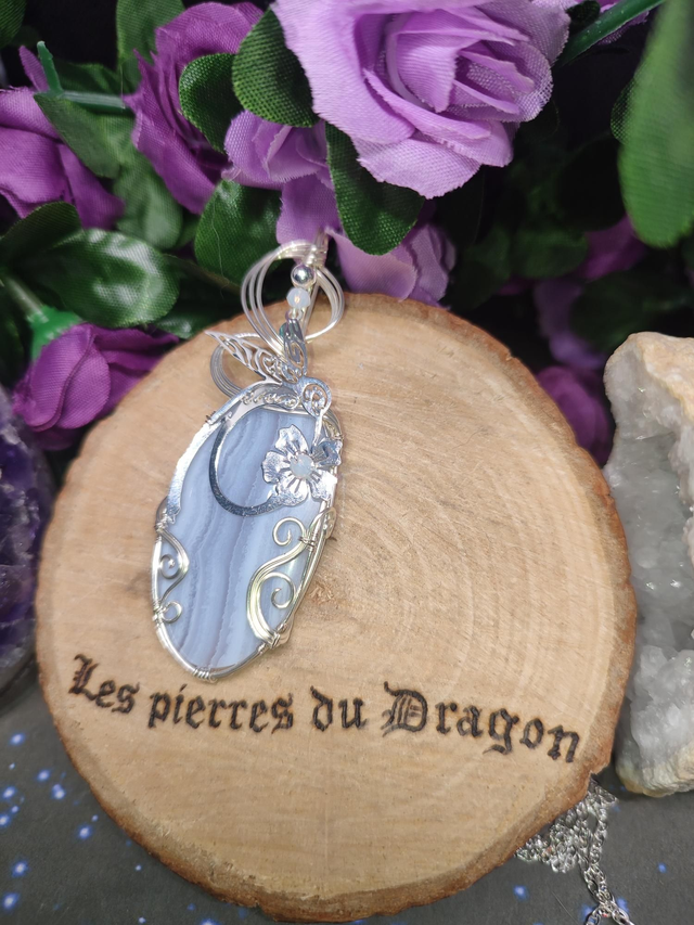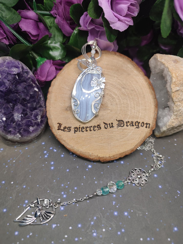 Composé d'agate blue lace naturelle sertie fil de cuivre plaqué argent, chaine métal plaqué argent offerte, perles fantaisies, autres composants acier inoxydable, bijou de dos assorti