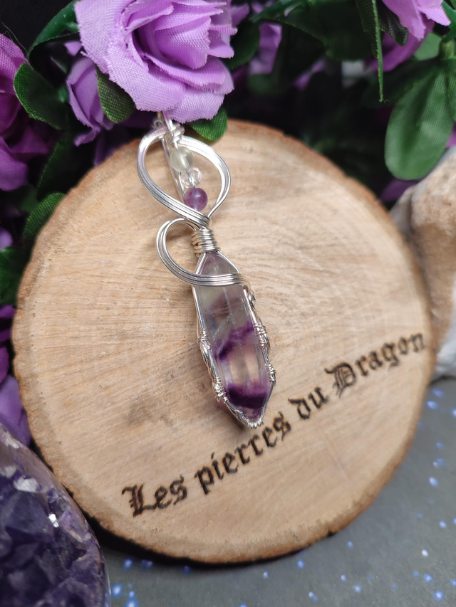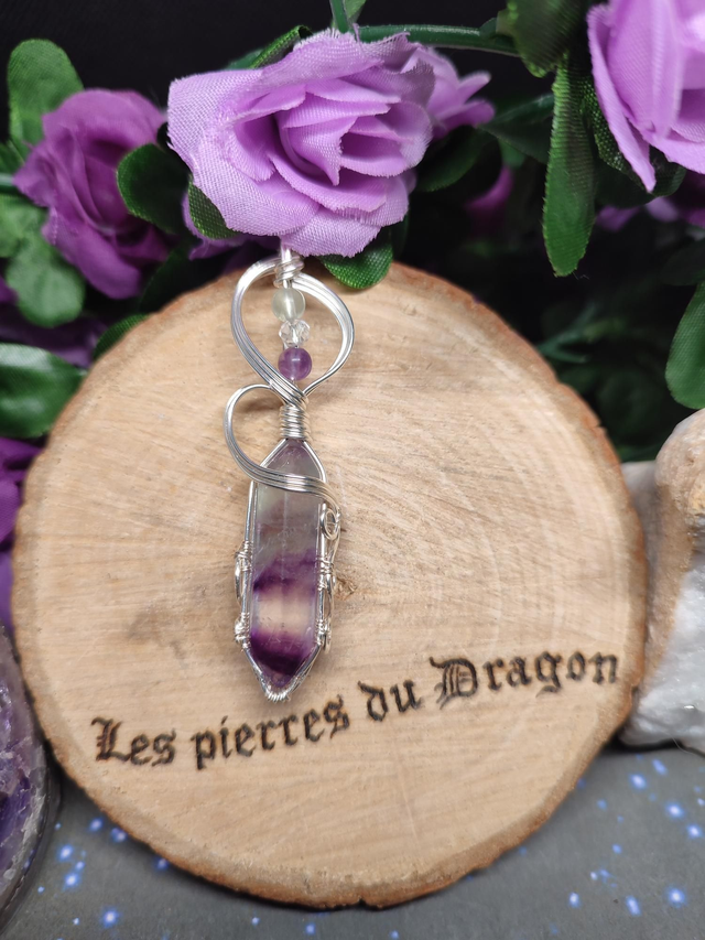 Composé de fluorite naturelle sertie fil de cuivre plaqué argent, chaine métal plaqué argent offerte, perles naturelles de fluorite, autres composants acier inoxydable.