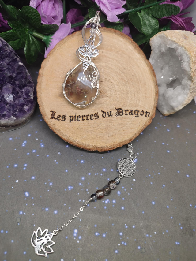 Composé d’agate mousse d’Indonésie naturelle sertie fil de cuivre plaqué argent, chaîne métal plaqué argent offerte, perles fantaisies et perle naturelle d'agate mousse, autres composants acier inoxydable.
