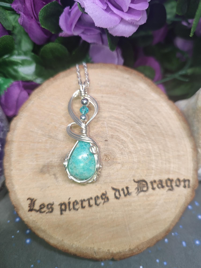 Composé d'amazonite naturelle sertie fil de cuivre plaqué argent, chaîne métal plaqué argent offerte, perles fantaisies, autres composants acier inoxydable.