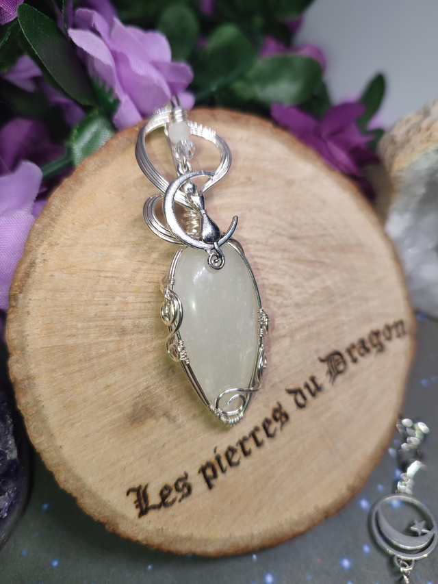 Composé de pierre de lune adulaire naturelle sertie fil de cuivre plaqué argent, chaîne métal plaqué argent offerte, perles fantaisies, autres composants acier inoxy