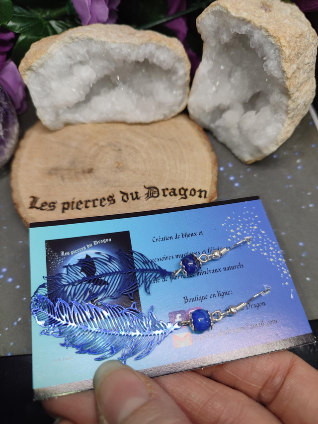 Ces boucles d’oreilles associent la profondeur du lapis lazuli à la légèreté du symbole plume, créant un bijou à la fois élégant et spirituel.