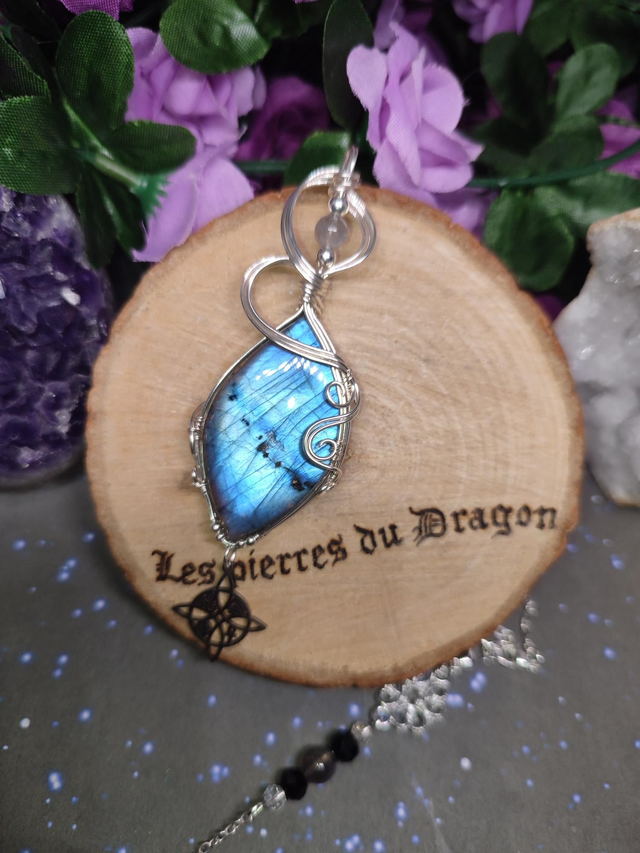 ✨ Composé de labradorite bleue naturelle sertie fil de cuivre plaqué argent, chaîne métal plaqué argent offerte, perles fantaisies, autres composants acier inoxydable, bijou de dos assorti.